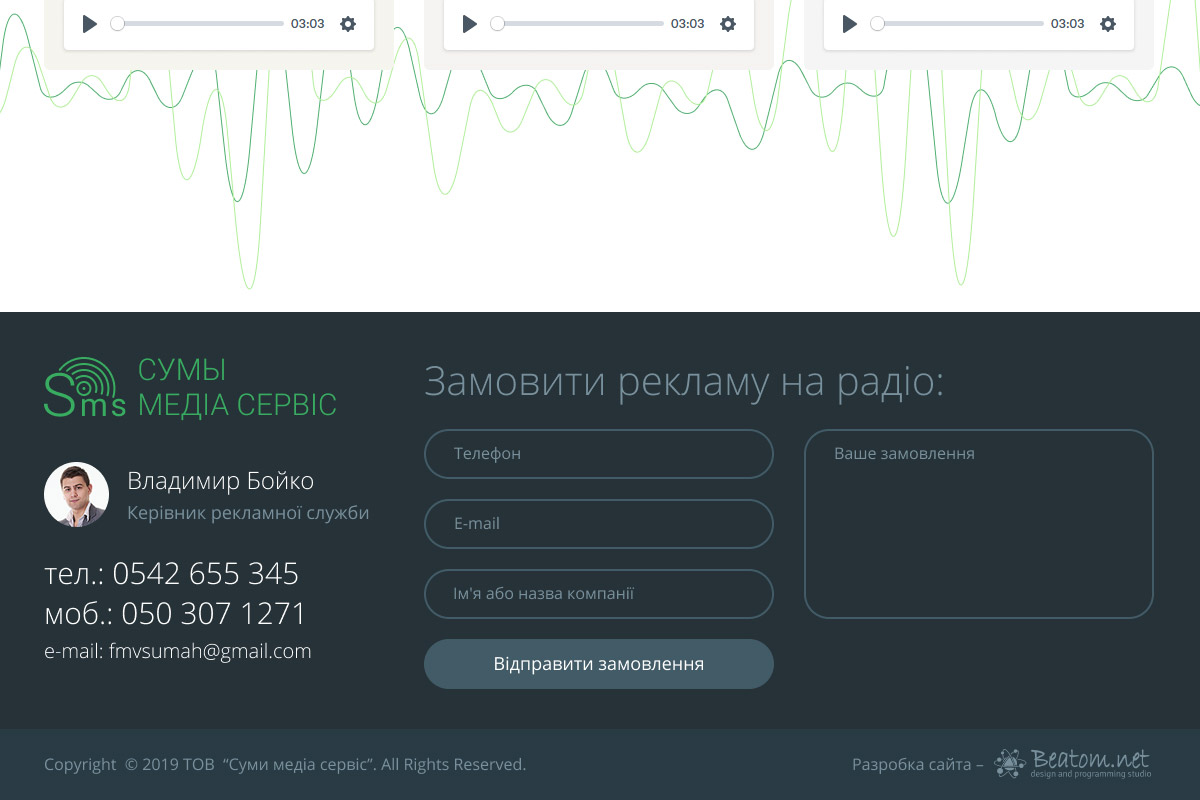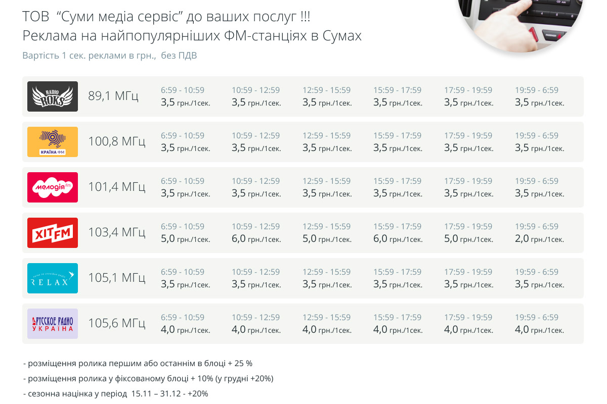 Створити лендінг, де буде інформація про тарифи на виготовлення рекламних роликів та вартість розміщення реклами на радіостанціях м. Суми