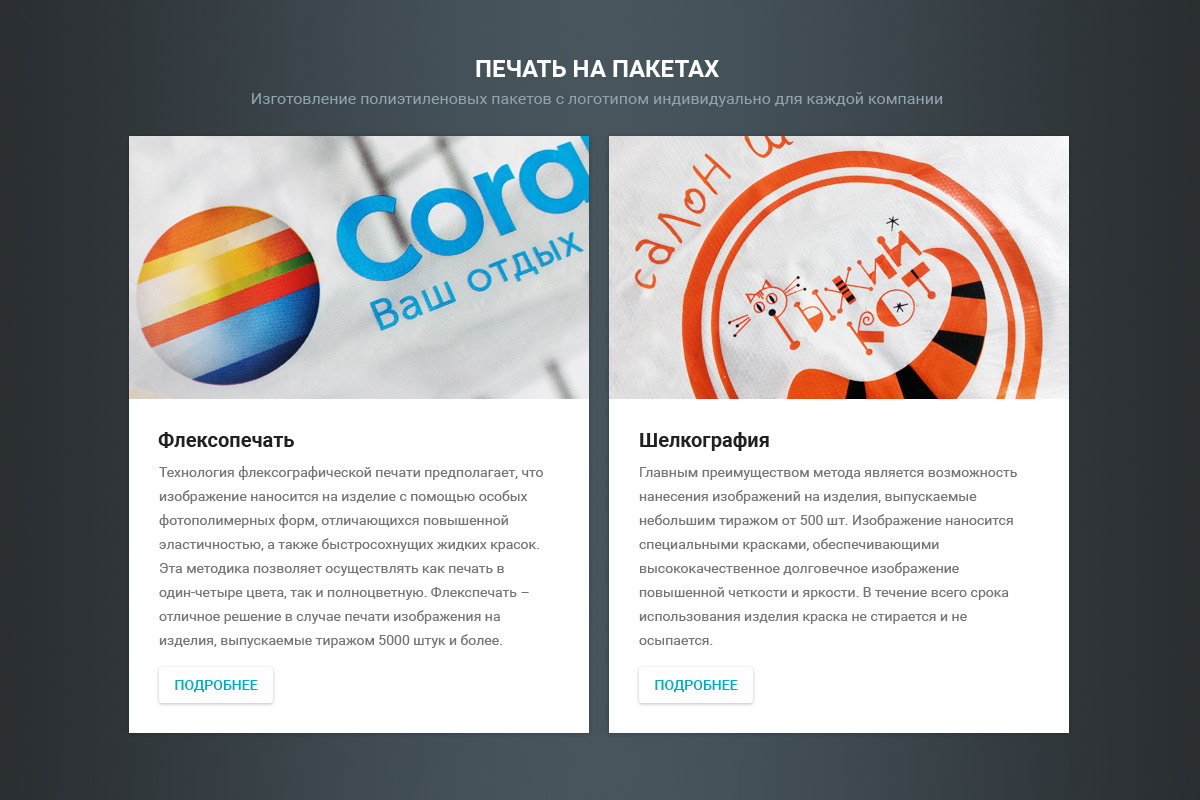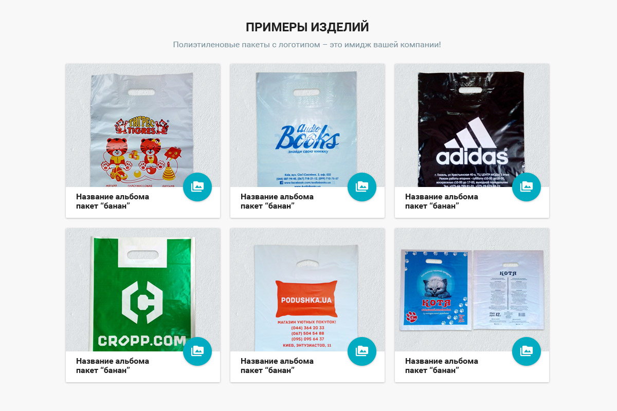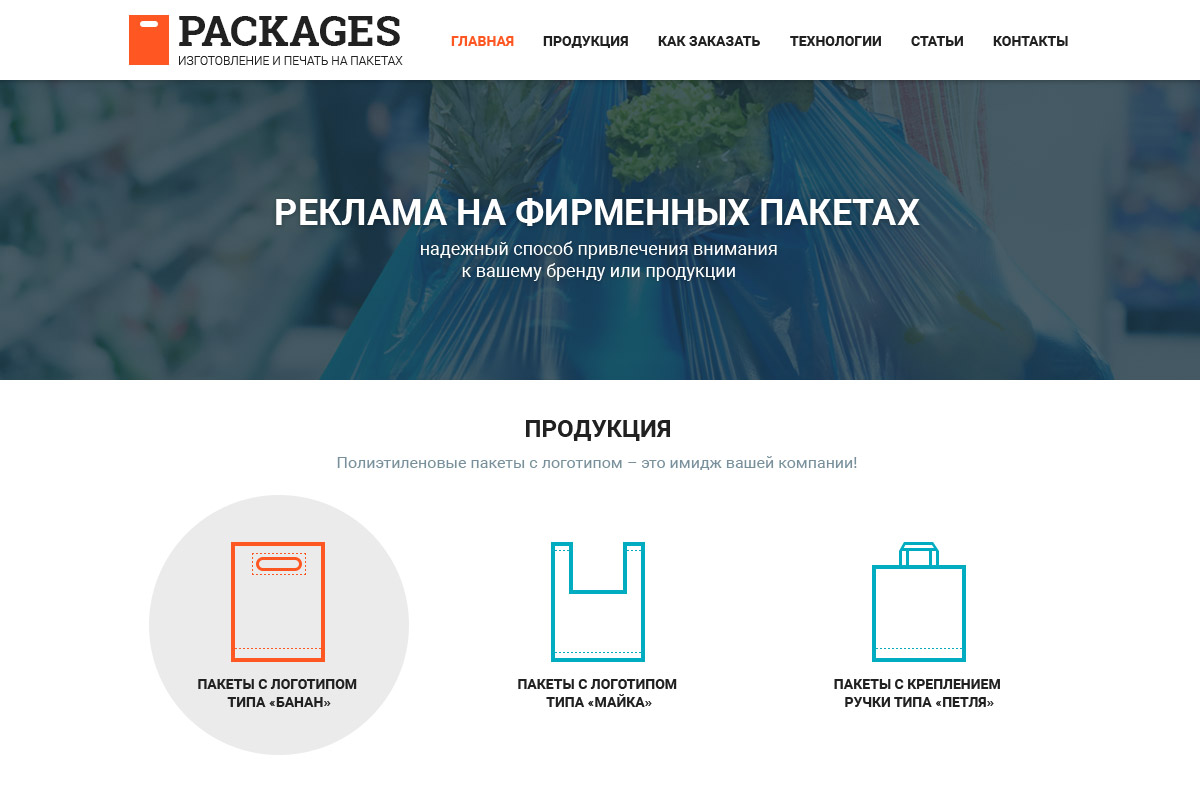 5. Розділ "Продукція", навпаки, розширити. Перемістити сюди з послуг "Пакети з петлевою ручкою", "Пакети з вирубною ручкою", "Поліетиленова плівка". Головне надати кожну категорію товарів на окремій сторінці, щоб вони не повторювалися.