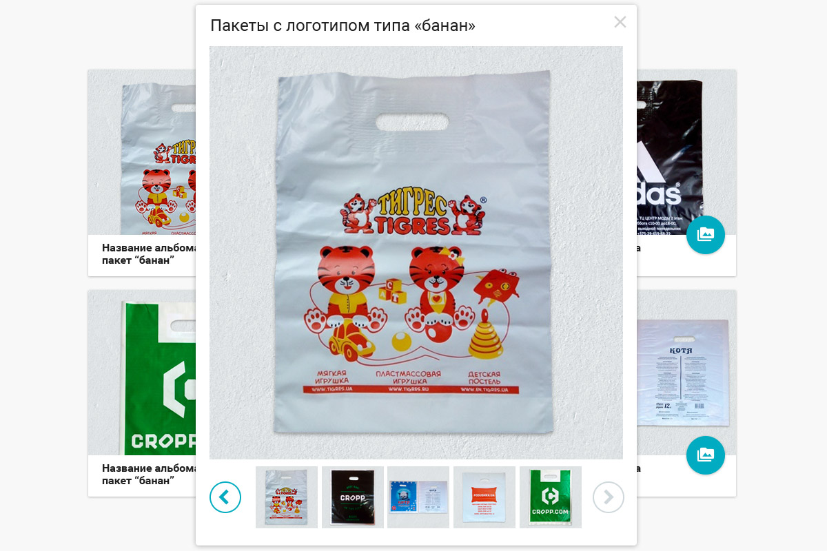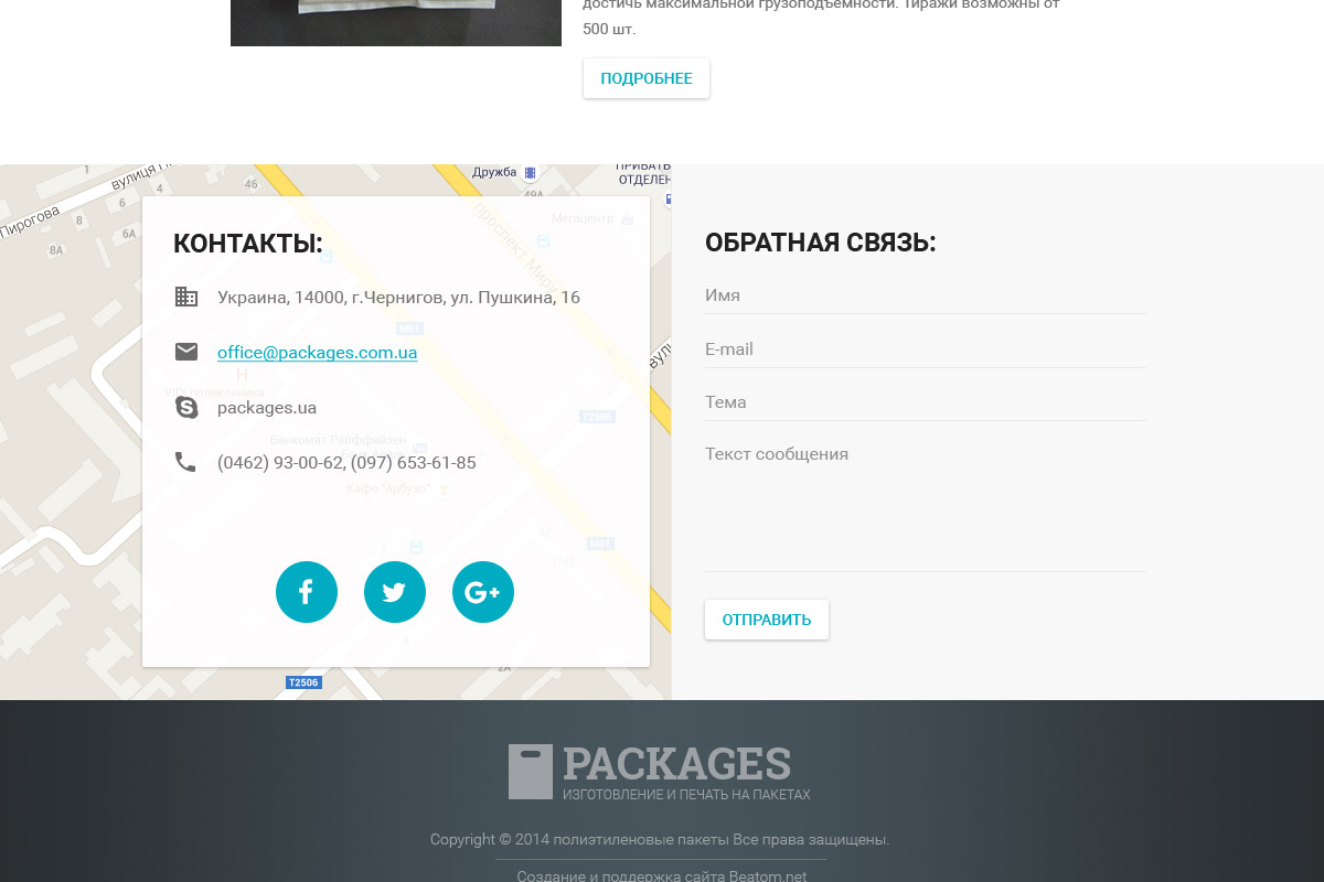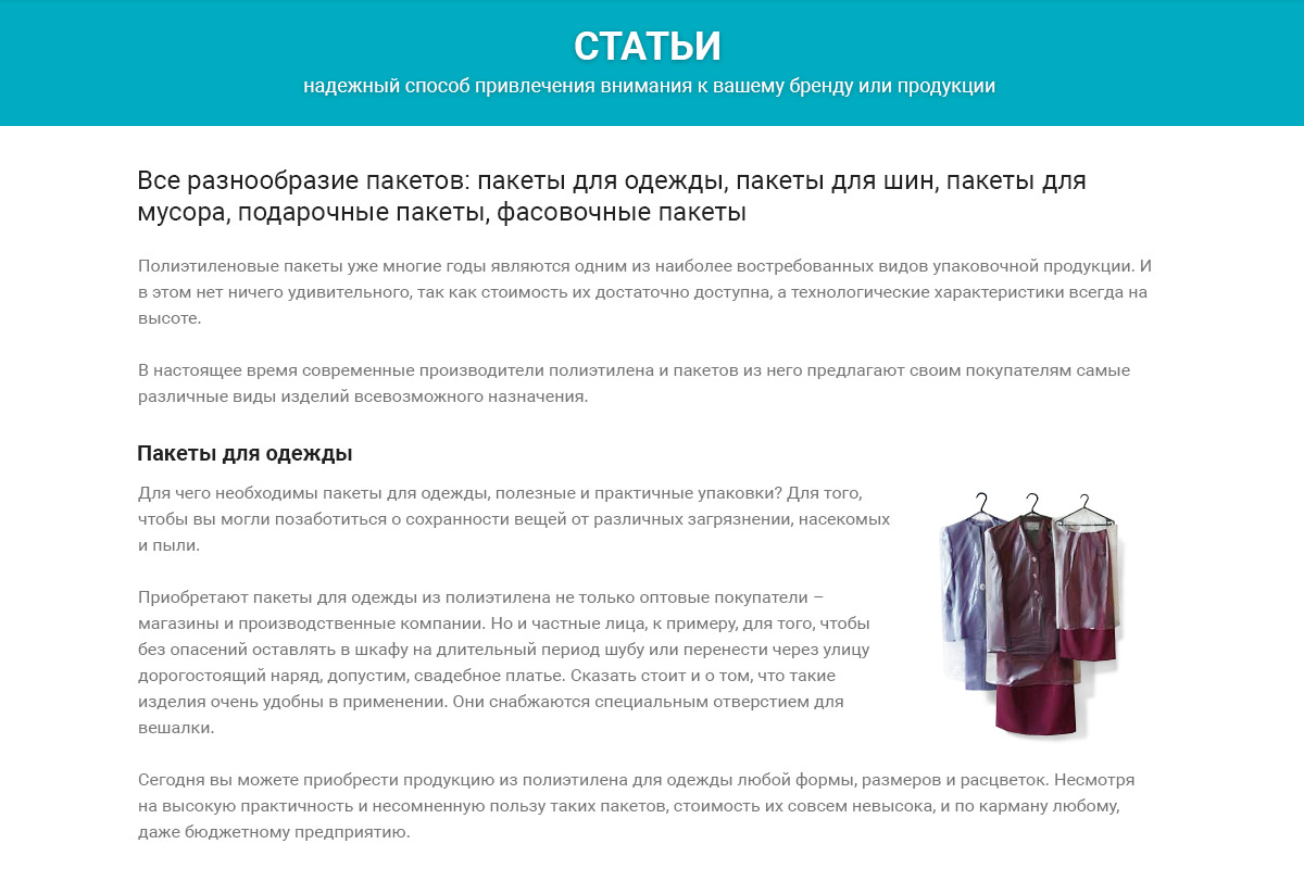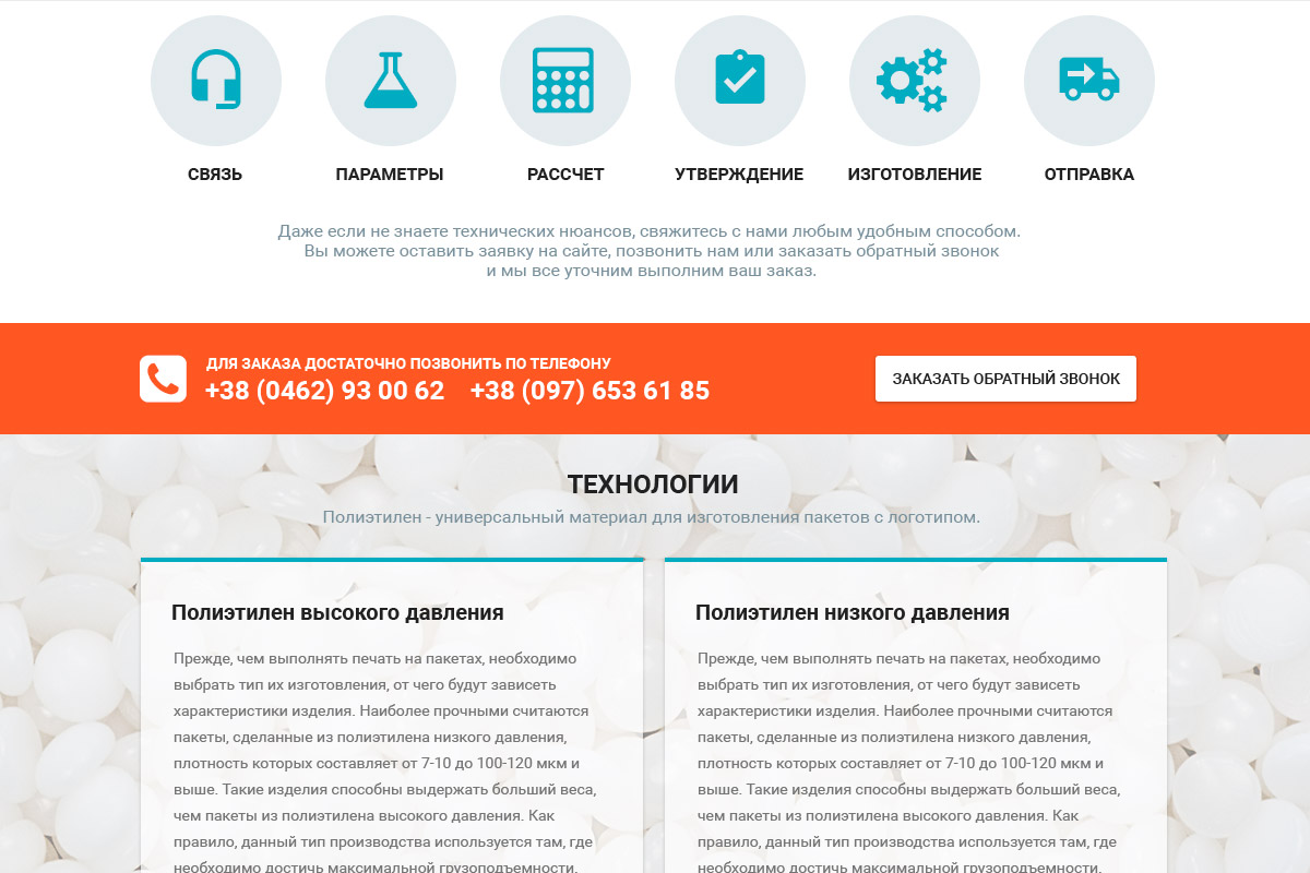 5. Розділ "Продукція", навпаки, розширити. Перемістити сюди з послуг "Пакети з петлевою ручкою", "Пакети з вирубною ручкою", "Поліетиленова плівка". Головне надати кожну категорію товарів на окремій сторінці, щоб вони не повторювалися.